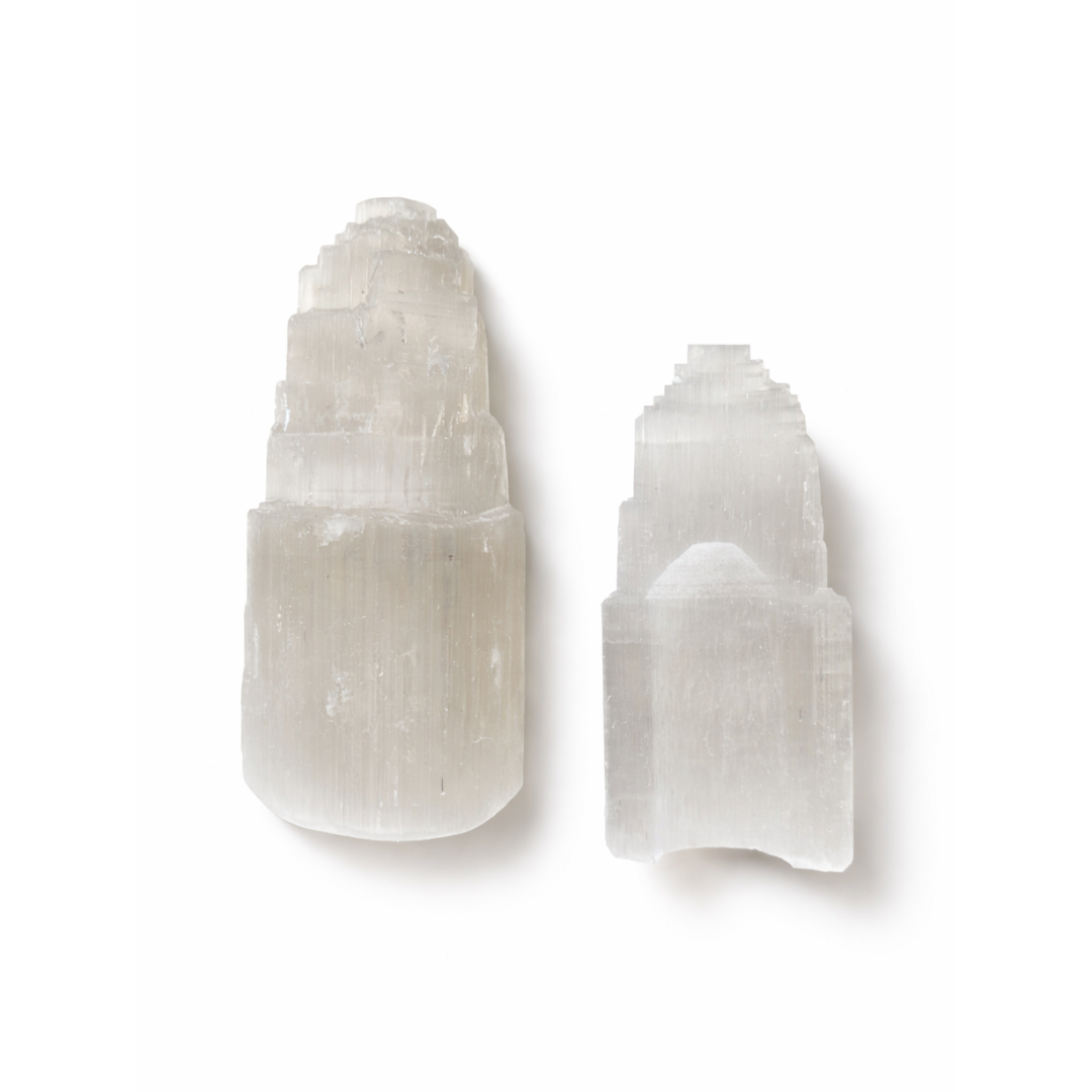 Rascacielos de selenita - media pieza imperfecta, una pieza tallada con la característica forma escalonada de este formato tan especial y decorativo.